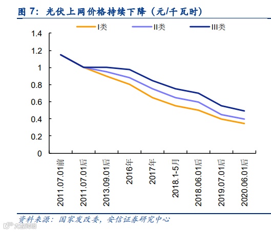 光伏上网电价持续下行,分布式光伏大有可为。据发改委数据,2020 年 6 月 1 日起,我国 I 类、II 类及 III 类地区光伏上网电价分别为 0.35 元/千瓦时、0.4 元/千瓦时、0.49 元/千瓦时, 价格较前期继续下行态势。此外,分布式光伏亦发展迅速,渗透率正快速提升。据国家能源 局和中国光伏协会数据,2021年上半年我国光伏新增装机13.01GW,分布式合计占比62%, 显著超过集中式,其中户用分布式占比 42%,同比增 24%,工商业分布式 20%,同比持平。在整县政策落地推动下,预计未来我国分布式光伏将加速发展。