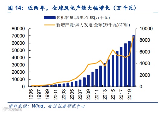 能源转型中,世界各国可再生能源的推进进程不可谓不快。据全球风能协会数据,全球风电 持续快速发展,2020 年更是呈现跃升态势,装机容量达 70739.6 万千瓦,同比大幅增长 13.92%;新增产能 8693.2 万千瓦,同比增 59.12%。据 21 世纪可再生能源政策网络数据显 示,2020 年全球太阳能光伏装机容量达 76 亿千瓦,同增 21.21%,为 2018 年的逾 15 倍。此外,从能源消耗结构看,各国可再生能源占比均有显著增长。根据 BP 数据,2020 年欧盟 可再生能源占一次能源消耗约 12.28%,较 2019 年增 1.56 个百分点;美国可再生能源消耗 占比达 7.01%,同比增近 1 个百分点。