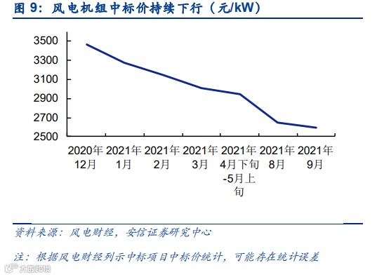 风电经济性开始凸显,陆上风电大机组化趋势凸显,海上风电开启由定式向浮式发展。据风 电财经统计,自 2020 年 12 月,我国风电机组中标价开始持续下行。2021 年 9 月,风电机 组中标均价约为 2592.45 元,较 2020 年末水平大幅下降逾 25%。此外,目前风电技术亦持 续升级迭代:陆上风电正向大机组方向演进,以充分提升中东部低风力地区的发电效率;海 上风电当前正朝“由定式转浮式,由近及远”方向转型,浮式海上风电有助于我国远海风电 电能的开发,是对海上风电利用的更充分探索。
