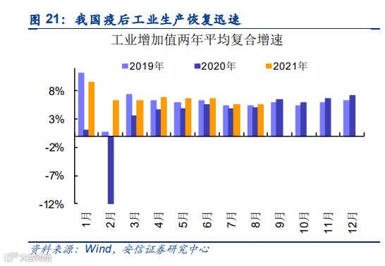 其次,疫后国内工业生产恢复,叠加海外疫情延续造成订单持续回流,能耗需求被大幅拉动, 旧产能下能耗红线更易被触及。2020 年第四季度起,我国疫后生产恢复势头迅猛,工业生 产的强劲复苏带来了更多的能源消耗需求。从两年平均复合增速的视角,自 2020 年 9 月, 我国工业增加值增速总体上均高于往年同期,而 2021 年继续维持该态势。此外,在海外疫 情反复下,国内迅速的复工复产也带来了大量制造业订单持续回流。我国工业出口交货值自 2020 年 Q4 起迅速增长,同比增速大幅提升;2021 年增势不减,且在印度、东南亚等地疫 情爆发之际,这一回流趋势再度强化,8 月出口交货值达 12055 亿元,同比增加 14.8%。我国出口额自 2020 年 Q4 起亦显著增长,并于 12 月达到历史高位;之后今年 8 月出口额再创 历史新高,达 2943.15 亿美元,两年平均复合增速为 17.03%。