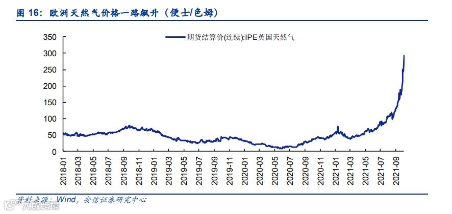 同时,考虑到核能安全性 问题,德国等也正加速去核电。此外,新能源发展虽快,但非正常气候放大凸显了其供 给的非稳定性及脆弱性。今年以来,作为风力发电主要地区,欧洲北海持续小风,风力 发电运行不佳。据风电纵横数据,Orsted 离岸风电厂当季平均风速为 7.8 公尺/秒,较去 年同期降低 7.14%。激进式的去煤、去核以及新能源供给不足和不稳定等因素下,作为 排碳量较小的一次能源,欧洲天然气需求大幅拉升。天然气供需缺口锐化引发欧洲气价 一路飙升,10 月 8 日 IPE 英国天然气期货结算价达 222.21 便士/色姆,为年初的 3.74 倍,去年同期的 5.74 倍。短期层面,随着俄欧博弈暂告一段落,俄罗斯对欧洲供气量 有望提升,欧洲能源紧缺态势有望得以部分缓解。但由于疫情发展及天气难以提前预判, 今冬能源危机是否恶化仍难以判定。