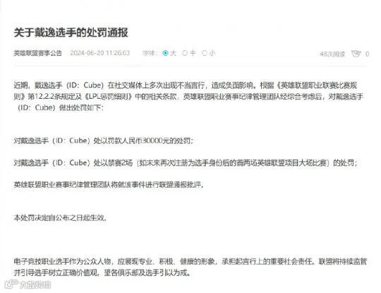 但时隔半个月,日前英雄联盟赛事官方却发布了对Cube的处罚公告。官方给出的理由是“在社交媒体上多次出现不当言行”,最终的处罚为30000元的罚款,以及禁赛两场。(如果未来他还打职业的话)