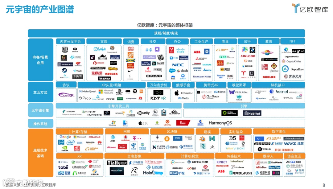 2021年以来,元宇宙的热度在全球范围内持续上升,成为科技热点和投资热点。日前,国内科技与产业研究机构亿欧EqualOcean发布《幻视元境——元宇宙行业洞察报告该报告在对元宇宙的关键要素、核心板块、市场规模、未来发展趋势等做系统分析与阐释的基础上,遴选绘制出元宇宙产业图谱。人工智能领域代表企业影谱科技被纳入元宇宙产业图谱,成为元宇宙领域的典型科技企业同时,该报告综合评估出国内元宇宙创新企业TOP20供行业参考,Meta、哔哩哔哩、影谱科技等国内外企业均实力上榜。