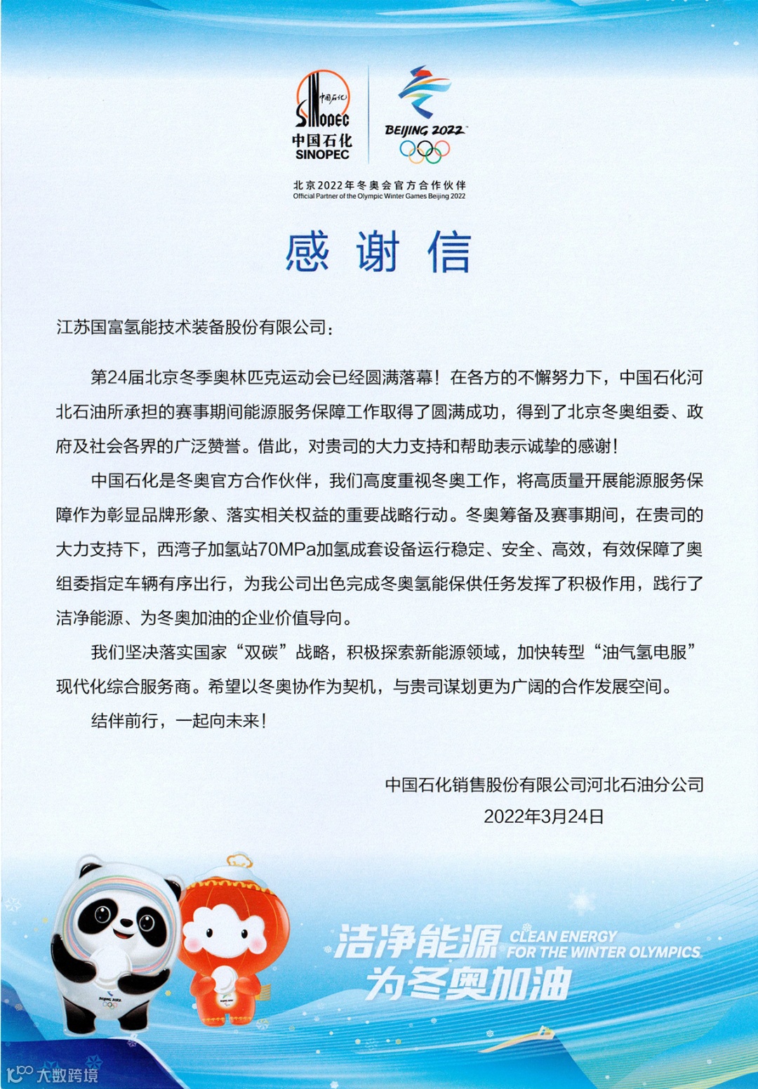 “全力以赴保冬奥,国富氢能创辉煌”,是中国石化销售股份有限公司河北张家口石油分公司对国富氢能保运团队的高度认可。多名服务人员在2021年12月15日就提前进入保运准备阶段;整整三个月封闭在崇礼赛区,牺牲了与家人春节团聚;冒着零下数十度的严寒,即充当设备保运的角色,同时又协助加氢,肩负“服务冬奥、氢能有我”的责任和使命,24小时坚守在加氢站工作岗位。