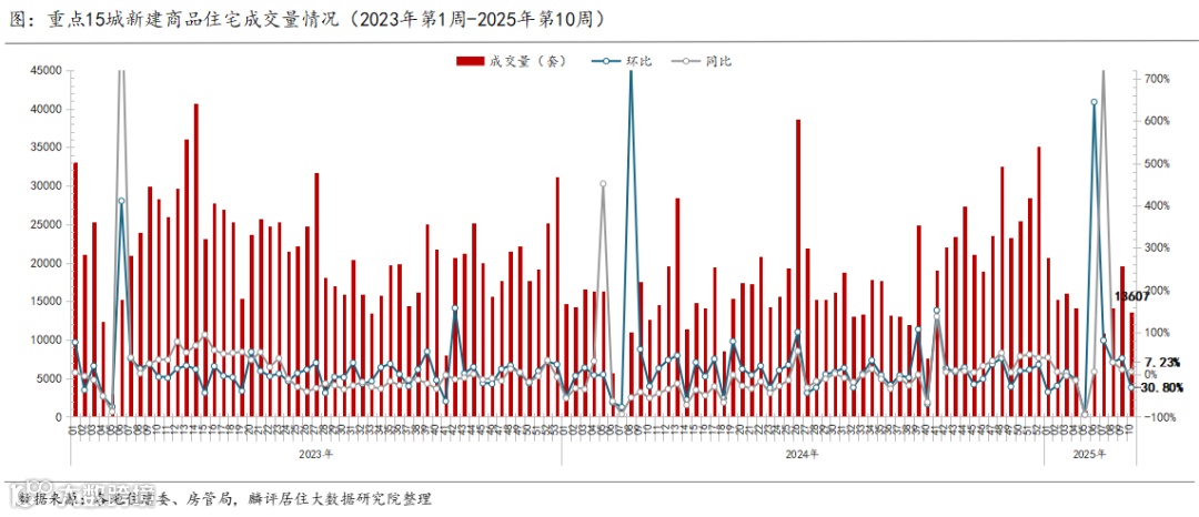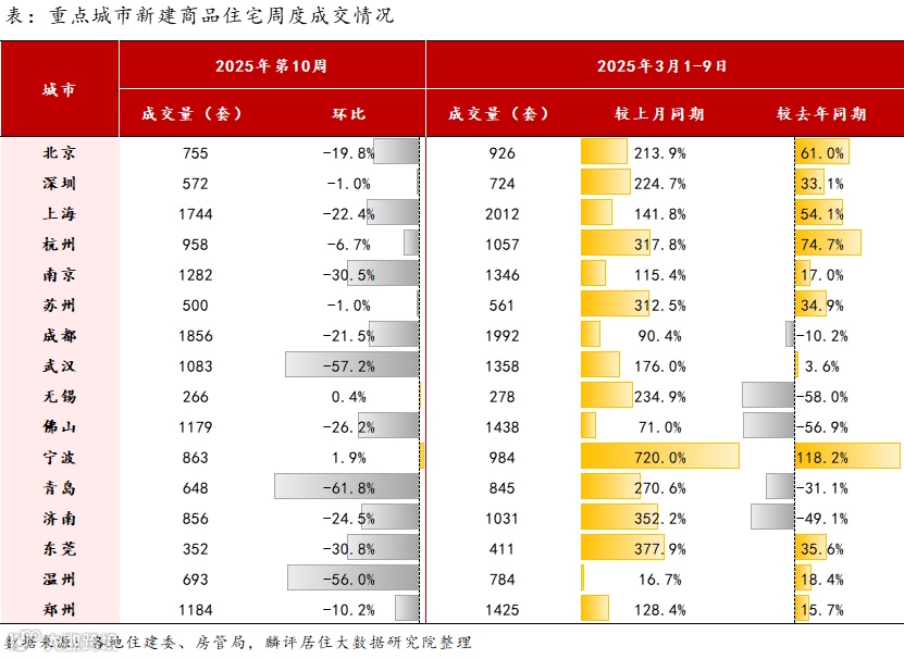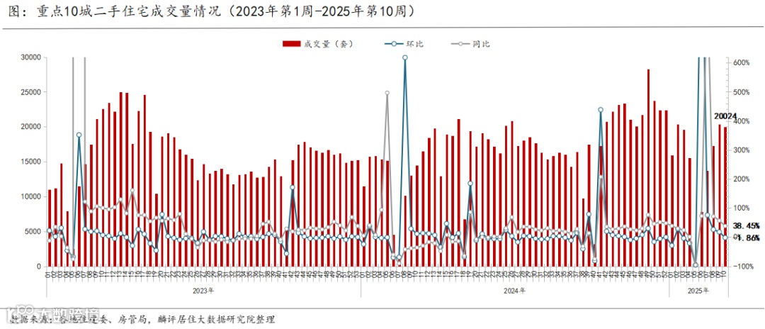 1、2025年第10周(3.3-3.9)监测重点城市二手房成交量环比下跌1.86%、同比上涨38.45%,新房成交同环比分别上升7.23%、下降30.8%。月内累计成交来看,2025年3月1日至9日,二手房、新房成交量分别较2024年3月同期上升26%、小幅下降6.2%。
