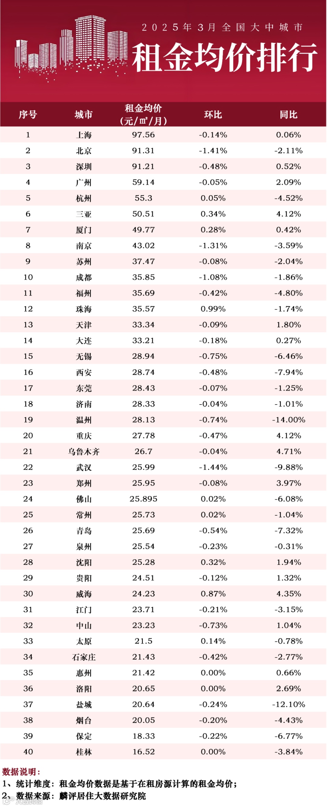 1.2025年3月,全国40个大中城市租金挂牌均价为34.56元/㎡/月,环比下跌0.28%,同比下跌1.66%,同环比跌幅分别较上月扩大0.02、0.19个百分点。