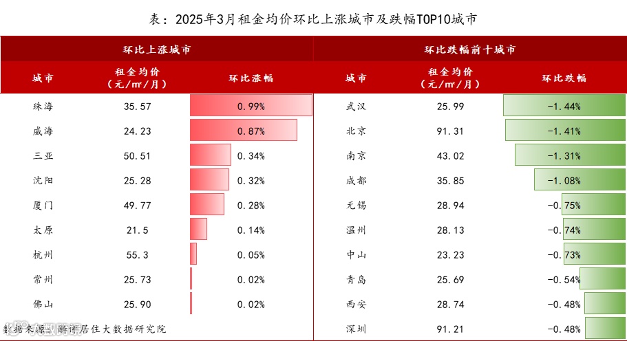 3.2025年3月,全国40个大中城市中,租金延续“跌多涨少”局势,有9城租金均价环比上涨,3城环比持平;28个城市租金环比下跌,较上月减少1城。其中,珠海、威海、三亚位居涨幅前三,环比分别上涨0.99%、0.87%、0.34%。