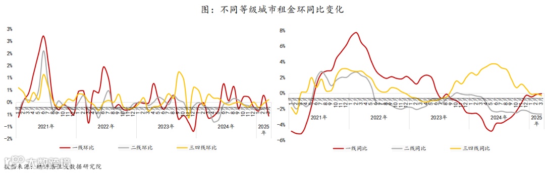 2.从各等级城市来看,2025年3月一线城市平均租金环比下跌0.56%,同比下跌0.07%;二线城市环比下跌0.27%,同比下跌2.66%;三四线城市同比下跌0.32%、环比上涨0.1%。