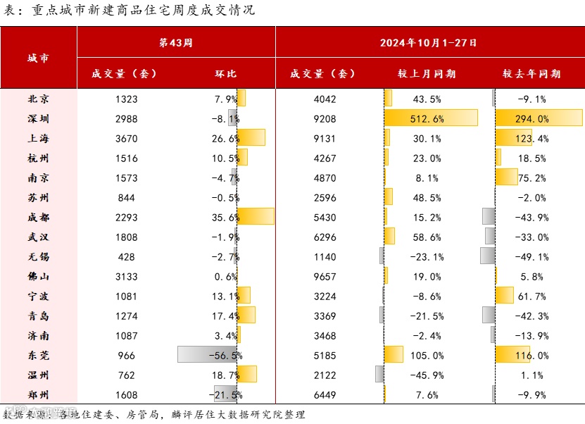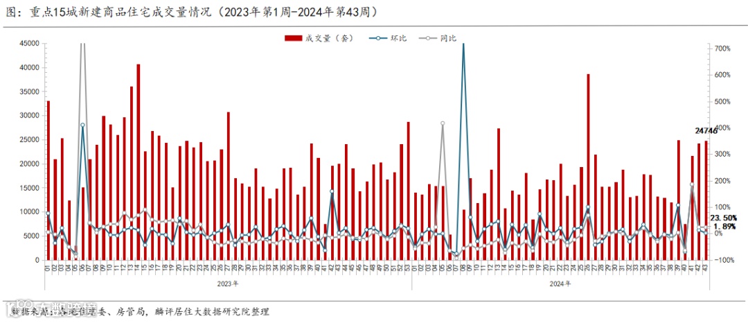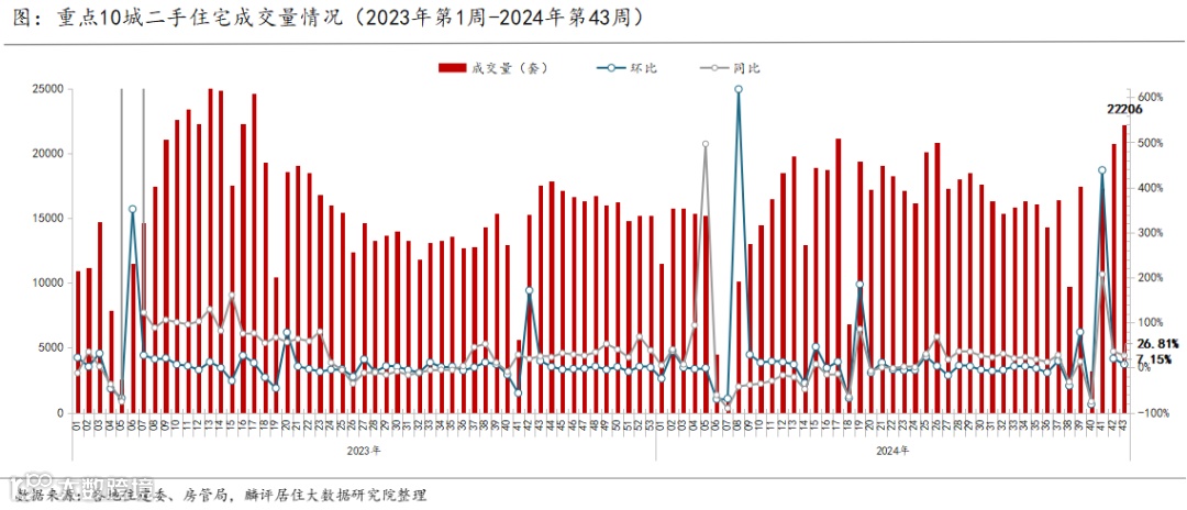 1、2024年第43周(10.21-10.27)监测重点城市二手房成交环比上升7.15%,同比上升26.81%;新房成交同环比分别上升23.5%、1.89%。累计成交来看,2024年10月截止至27日,二手房成交量较去年10月同期上涨10.39%,新房上涨10.95%。