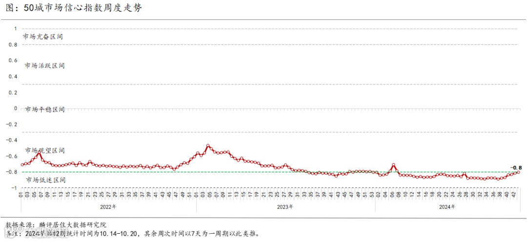 2、2024年第43周重点50城的市场信心指数为-0.8,较上周回升0.01。从近期走势来看,市场信心指数自第38周起连续上升3周,第41周维稳,第42、43周再现连续回升趋势。
