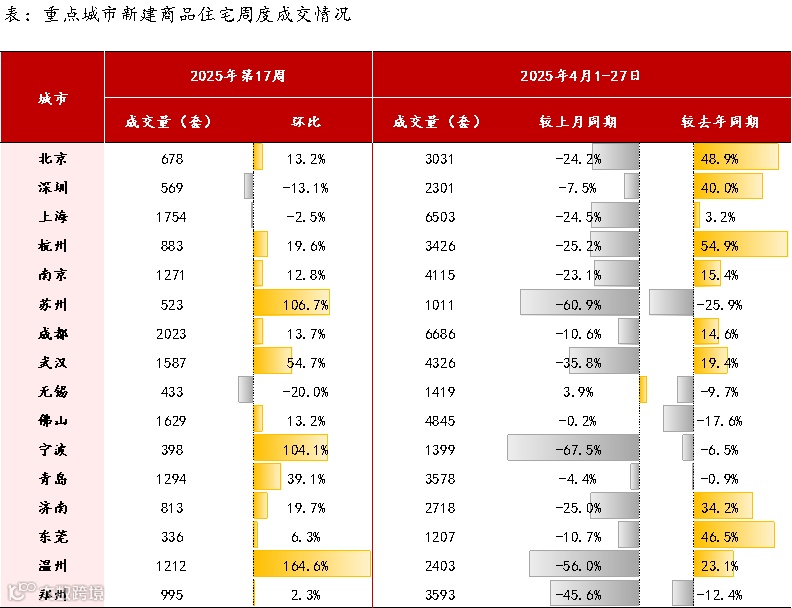 2、2025年第17周,重点15城新建商品住宅成交量为15403套,环比上升22.9%,同比下降20.7%。从月内累计成交来看,2025年4月1-27日,重点15城新建商品住宅成交52563套,较今年3月同期下跌28.1%,较去年4月同期上升9.4%。
