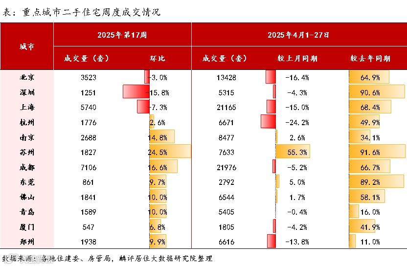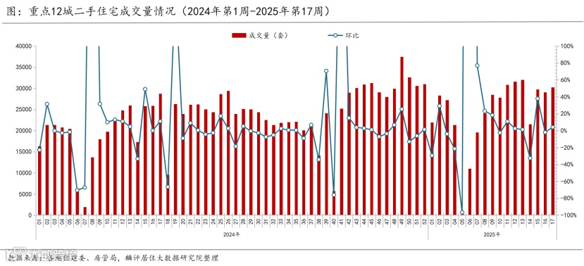 1、2025年第17周,重点12城二手住宅成交量为30302套,环比下降4.06%,同比上升5.46%。从月内累计成交来看,2025年4月1-27日,重点12城二手住宅成交107827套,较上月同期下降6.8%,较去年同期大幅上涨56.4%。