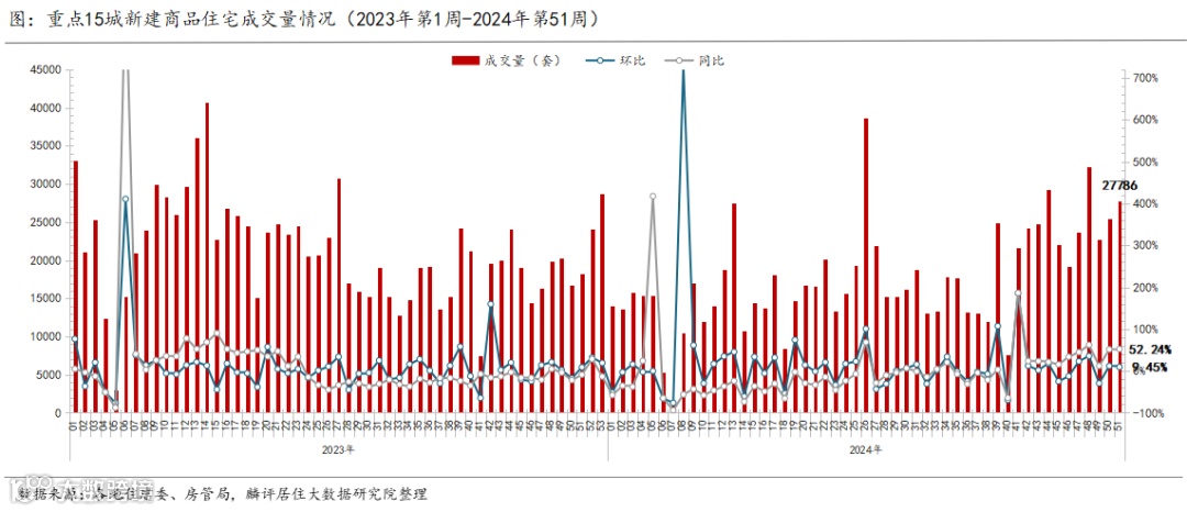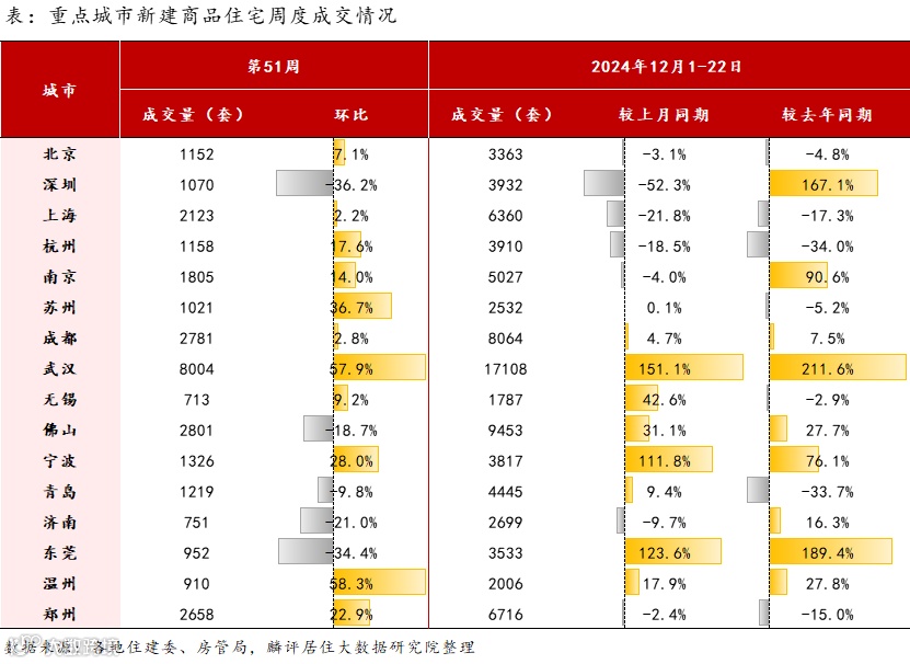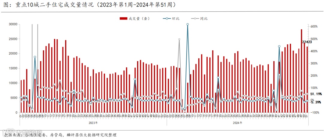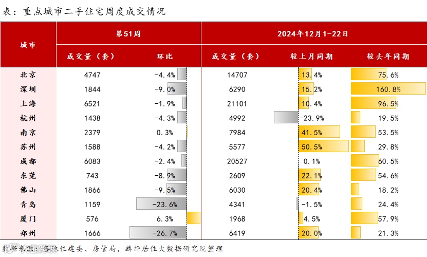 1、2024年第51周(12.16-12.22)监测重点城市二手房成交同比上升51.19%,环比下降5.39%;新房成交同环比分别上升52.24%、9.45%。累计成交来看,2024年12月截止至22日,二手房、新房成交量分别较去年12月同期上升53.81%、29.77%。