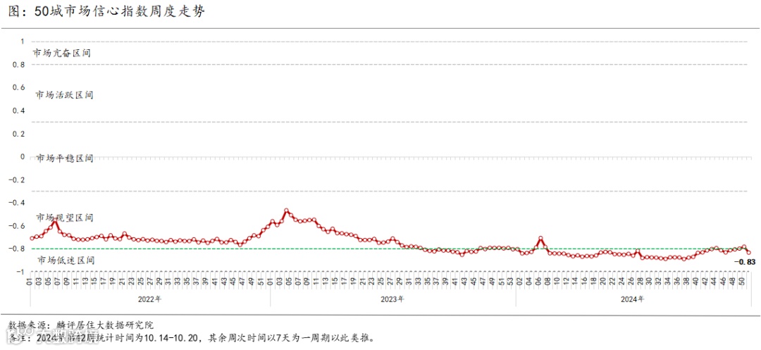 2、2024年第51周重点50城的市场信心指数为-0.83,较上周回落0.05。本周市场信心指数结束“四连升”局势转为下降,尚且仍徘徊于市场低迷区间,市场信心恢复的稳定性还需持续观察。