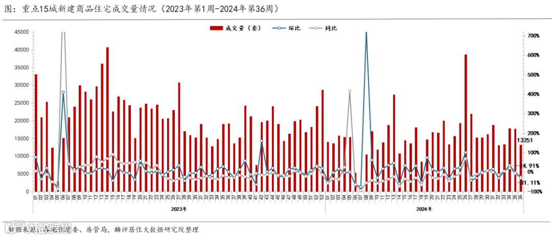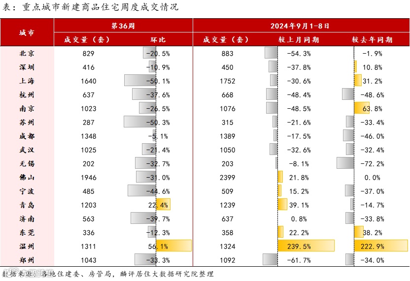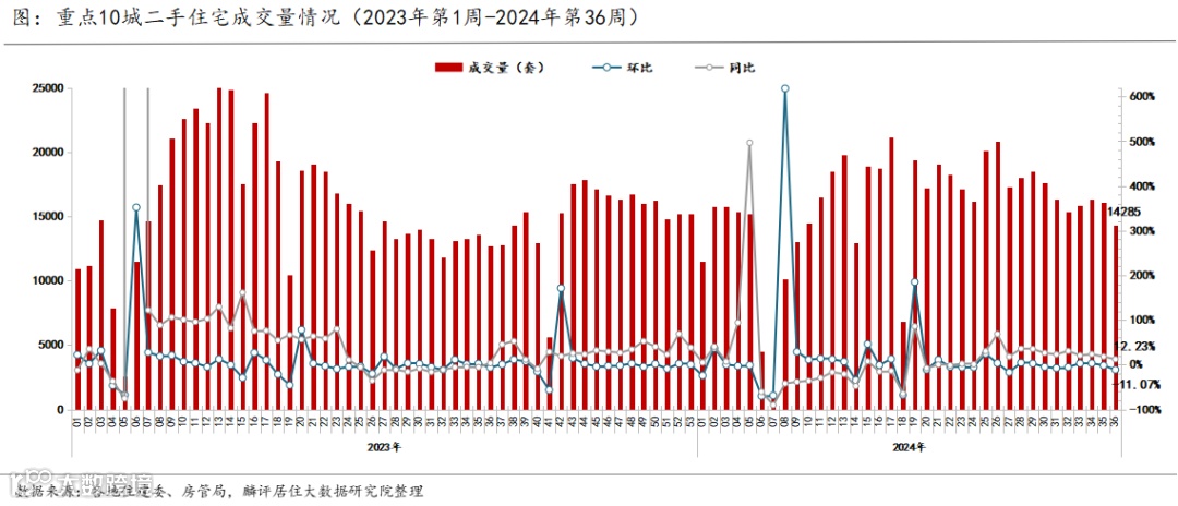 1、2024年第36周(9.2-9.8)监测重点城市新房成交环比下降24.91%,同比下降31.11%;二手房成交环比下降11.07%,同比上涨12.23%。累计成交来看,2024年9月截止至8日,新房成交量较去年9月同期下降12.1%,二手房上涨1.23%。