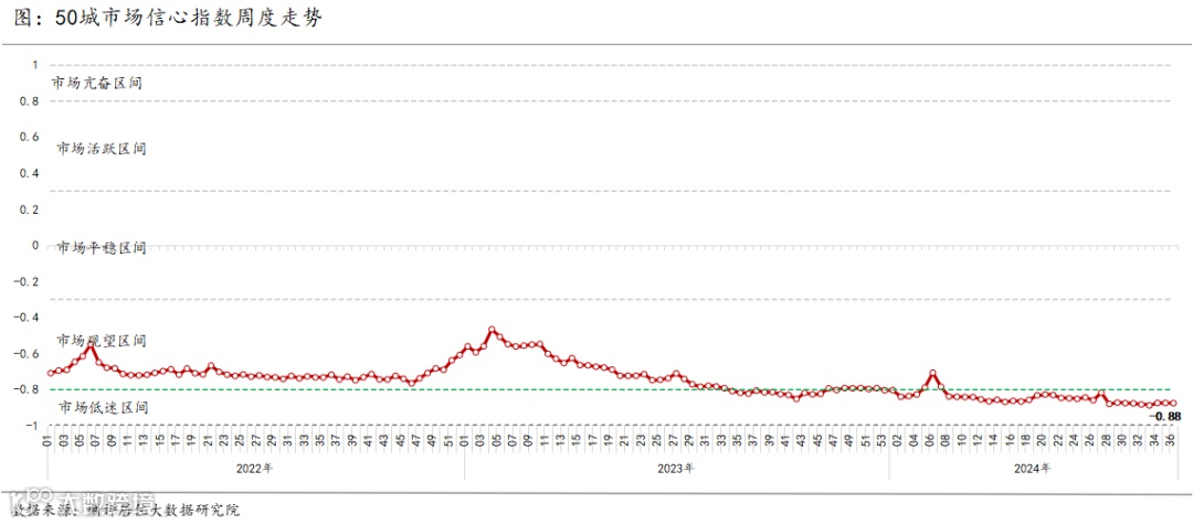 2、根据麟评居住大数据研究院监测数据显示,2024年第36周重点50城的市场信心指数为-0.88,较上周持平,市场信心指数已连续29周处于低迷区间。