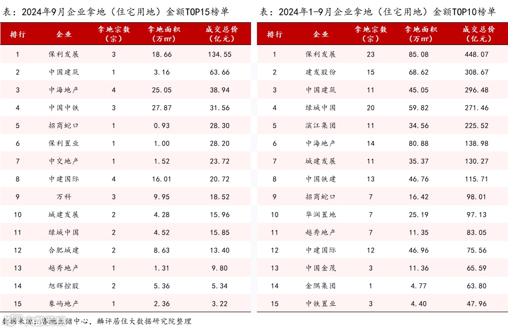 3.从房企表现来看,9月保利发展加速扩储,继续掷资134.55亿元拿下3宗住宅用地,遥居单月拿地金额首位;中国建筑凭借63.66亿元夺得9月单月拿地金额第二位;中海、招商、万科等品牌头部房企当月土储亦有收获。