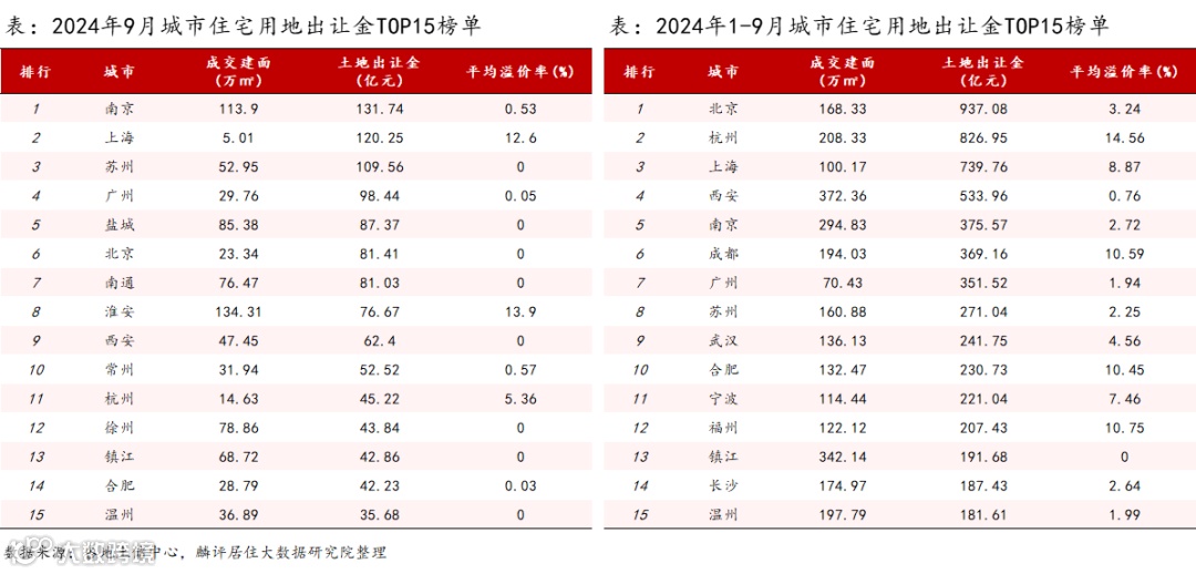 9月全国宅地出让收入环比上涨,南京、上海、苏州单月收金超100亿领先