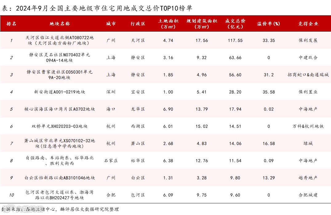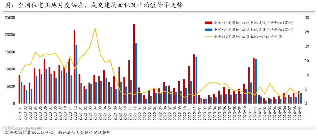 1.9月土地供需规模稳步上升,总体热度持续不足。数据显示,2024年9月全国住宅用地供应、成交建设用地面积环比分别上升19.8%、48.5%;9月全国住宅用地平均成交溢价率为3.18%,较上月回落0.93个百分点。