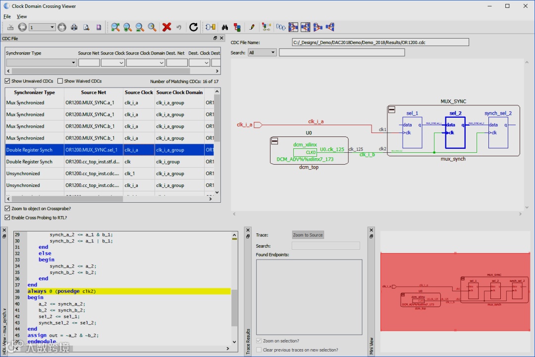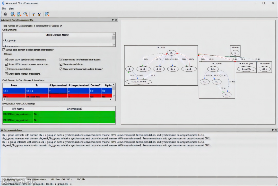 高级时钟环境,提供可视化的时钟树和异步时钟域交叉显示,帮助用户分析时钟域交叉亚稳态设计,旨在解决迭代过程中对时钟域交叉重置反应延时所带来的问题。