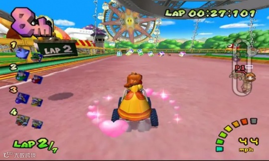 当然除了技术力外,初代马车还为一个游戏传统打下了坚实的基础,那就是分屏式游玩。初代马车不管是多人还是单人,玩家在玩的时候都会分为上下双屏,只是单人模式下下半边的屏幕会变成赛车地图。其实这里任天堂是偷懒了,因为游戏并没有为单人模式写代码,所以就留下么个半成品模式,但游戏一开始就是以多人设计为主,自然就不需要额外花成本去做了。