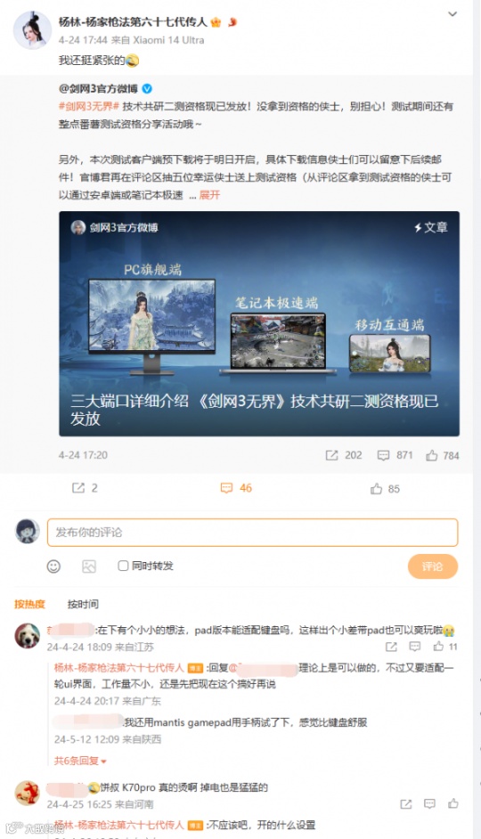 在游戏行业,新游戏的推广往往伴随着厂商在各大平台的巨额广告投入。然而,《剑网3无界》的推广却呈现出了一种截然不同的景象:自官方官宣公测定档6月13日起,各大社交平台上涌现了无数玩家自发的宣传行动。