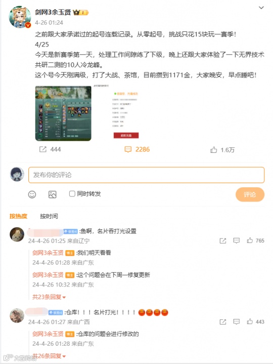 如果不把《剑网3无界》问世看作是“一款基于商业考量而诞生的新作”,而是把他看作项目组对玩家15年支持的一份答卷,那就显得合情合理了。剑网3官方素来以亲民著称,《剑网3》系列制作人郭炜炜、执行制作人咸鱼(余玉贤)、主程序杨林等团队成员常常在微博等社交媒体上与玩家进行直接交流,分享游戏的更新内容。