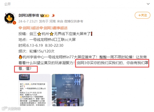 于是我们也看到了在全国各地,这群最好的玩家“真·用爱发电”,在他们的城市用绝对的实力,以最亮眼的方式,点亮一块又一块的广告大屏,自发为《剑网3无界》公测宣传造势呐喊——