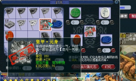 他正好还有个铠甲元身,幻化65次都没出双加属性,于是找到了老王帮忙,老王一通操作后在第91次幻出了力敏双加。