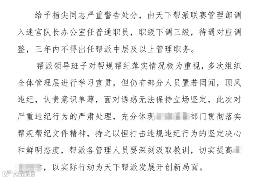 这份公告是一份人事调整通知,内容直指天下帮派原管理主任“指尖”,因其私下接触对手帮派管理层,在5月3日帮战故意失误导致杀树落后,所以管理层决定将“指尖”的职务下调3级。此外,管理层还强调帮规的重要性,希望帮众要认真学习,抵制外来诱惑,为帮派发展开创新局面。