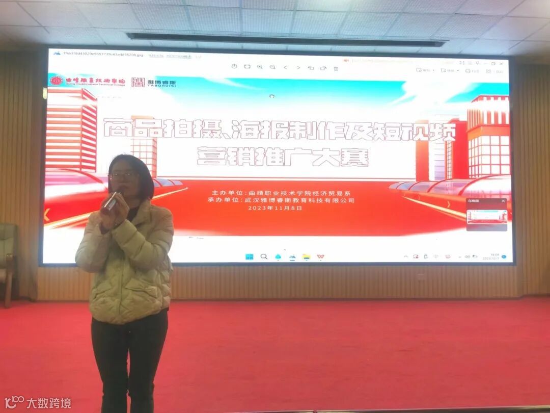 颁奖结束后,曲职院电商教研室何刘琳老师上台致辞,对参赛选手的精彩表现表示点赞,同时也提出了一些改进方向——选题需要更贴近大学生,内容也要更突出营销目的。雅博科教学术督导张蒙老师同时也对参赛选手表示了肯定——全面展示了自己的技能、技巧和风采,给大家带了一场美妙的视听盛宴。同时也鼓励大家,不断完善自己,不断挑战高峰,不断勇敢追逐自己的梦想!