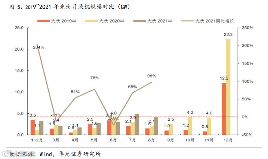 2021 年 1—8月份,全国发电装机容量228254 万千瓦,同比增长 9.5%, 发电 53894 亿千瓦时,同比增长 11.3%。其中,太阳能发电装机 27513 万千瓦,同比增长 24.6%,太阳能发电增长 8.5%。在 2021 年保障性并网规模不低于 90GW 的政策指引下,四季度需求将得到显著提振。