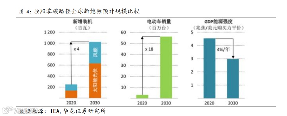 为应对全球气候变暖,多国承诺将全球气温上升限制在 1.5°C。IEA 署长 Fatih Birol 提到,由此制定的"净零"路线图中要求,到 2030 年, 全球太阳能光伏发电新增装机达到 630GW,相当于每天安装一个现有最大 的太阳能电站的规模。这样到 2030 年,实现全球能源效率平均每年可提高 4%,约为过去 20 年平均水平的 3 倍。其中,到 2050 年,全球发电总量的近 20%来自太阳能光伏和风能。