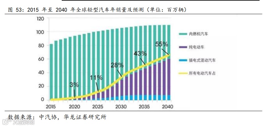 仅次于中国,占全球电动汽车市场销售额的 14%,美国排名第三,占 11%。到 2040 年,全球预计将售出约 6,000 万辆电动车,相当于全球汽车市场的 55%;电动汽车保有量达到 5.59 亿辆,占所有类型汽车保有量的 33%。