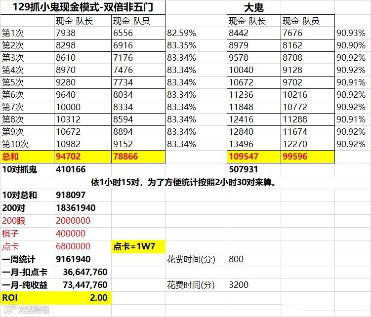 捉鬼玩法不仅基础奖励高,而且有几率收获环装,属于日常必做任务之一。有位129玩家分别统计了队长和队员的大小鬼收益情况,五开玩家完成一轮能一共获得91W梦幻币。如果你的效率是1小时15对,一周捉完200只鬼总耗时是800分钟,收益大概为1800W,扣除点卡、天眼等消耗还有910W。