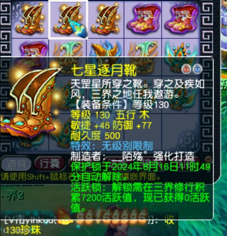 今天,有名老板买了好几车高端装备进行巅峰冲刺,终于圆梦“牛了无级别”成就。这是130无级别鞋子,属性比国标略高,不仅可以镶嵌多锻黑宝石争夺一速,还有5孔抗封效果,算是X9群雄玩家的必备硬件,应该能卖个令人满意的价格。
