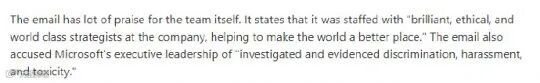 这份邮件的内容中主要提到了对DEI团队的赞扬,以及对微软高管的不满。其中提到:“团队拥才华横溢、道德高尚、世界一流的战略家,致力于让世界变得更美好......微软移走了一座不可能的大山(DEI),微软的领导层存在歧视、骚扰和恶意行为。”