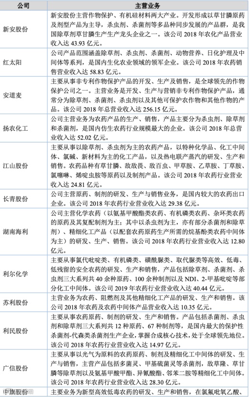 行业的主要企业分为两部分,一部分以拜耳、巴斯夫等为代表的国际知名农化公司,公 司与其主要是产业链上的合作关系,目前未与其产生直接竞争。另一部分是国内农药企业, 根据其规模大小可以分为以下三个层次:第一是销售规模在 40 亿元以上、以安道麦、扬农 化工等为代表的大型上市农化企业;其二是销售金额在 10 亿元以上 40 亿元以下的大中型农化企业;其三为众多中小型企业。国内农药同行业上市公司基本情况如下表所示: