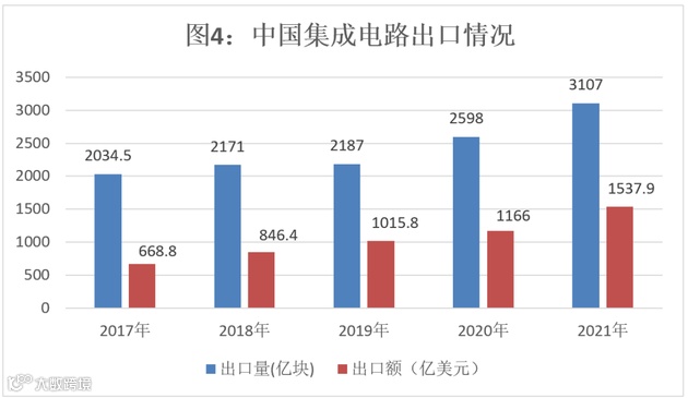 2021年中国集成电路产品进出口都保持较高增速。根据海关统计,2021年中国进口集成电路6354.8亿块,同比增长16.9%;进口金额4325.5亿美元,同比增长23.6%。2021年中国集成电路出口3107亿块,同比增长19.6%,出口金额1537.9亿美元,同比增长32%。