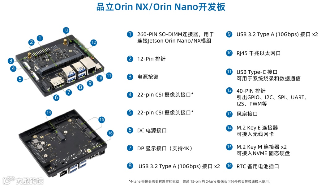 品立Orin NX/Orin Nano开发板支持4个NVIDIA Jetson模组型号,分别为Orin NX 16GB(算力157TOPs)、Orin NX 8GB(算力117TOPs)、Orin Nano 8GB(算力67TOPs)、Orin Nano 4GB(算力34TOPs),可根据应用场景算力需求灵活选配。