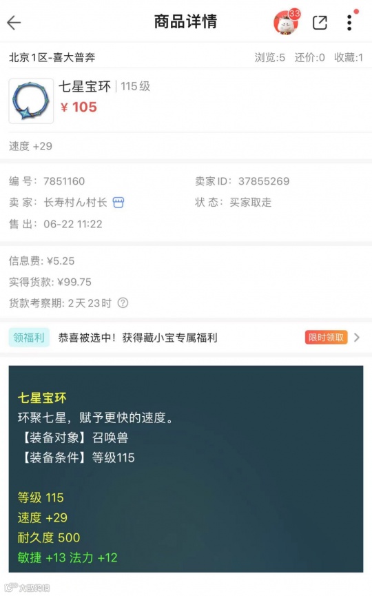 最近,有玩家分享了个人卖货经历,他以105元价格卖了一个115宠装环圈。这个环圈的初始速度29、敏法加成共25,这初始速度属实过低,敏捷加成有点鸡肋,换算下来大概是40速度、加5敏12法(1550速资宠)。