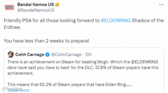 而除此之外,玩家们为了迎接【黄金树幽影】的发布其实还有其他的准备工作要做。今早万代南梦宫就发推提醒大家:按照Steam平台展示的数据,现阶段有高达62.2%的《艾尔登法环》玩家,还不具备进入DLC地图开始新的挑战的资格。