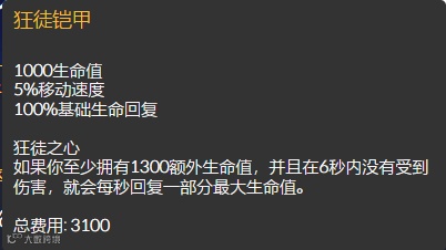狂徒回血效果的触发条件是1300点额外血量,这个数值乍一听好像很高。可是在辅助装、坚决系天赋的加成下,达到1300点额外血量其实很轻松。早在14.10版本,辅助狂徒时光就火过一阵。到了现在,狂徒已经成为了职业选手都在选择的出装打法。