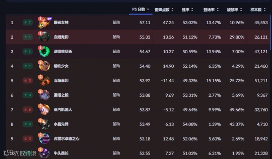 一方面,这跟拳头增强了前期镀层的厚度,导致换线战术无法再应用起来有关;另一方面,则是因为野核英雄增加,使得辅助不得不选择一些拥有开团能力的角色。这点在路人局也有所映射,目前在韩服高分段,优先级最高的十个辅助英雄,其中九个都是硬辅。