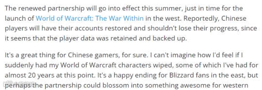 在该新闻中,外媒表示微软、暴雪与网易的战略伙伴关系会在今年夏天生效,为了是赶上魔兽11.0新版本的全球同步,给到国服玩家一个足够有诚意的回馈。因此,微软保证所有的国服玩家数据都已经被保留与备份,不论你有没有下骨灰盒都不会丢失进度。