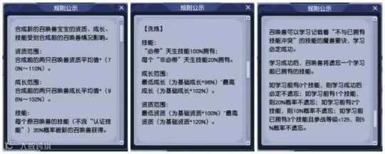 如上图所示,游戏内公布了合宠,洗炼,打书三种玩法下的概率情况。合宠炼妖时,每个原召唤兽的技能(不含“认证技能”)将有35%的概率被新的召唤兽获得。洗炼时,每个“非必带”天生技能有20%的概率被新宝宝拥有。打书方面只是公布了基本的玩法规则,而玩家们通常说的“前推”、“跳位”等情况并没有相关的公示说明。