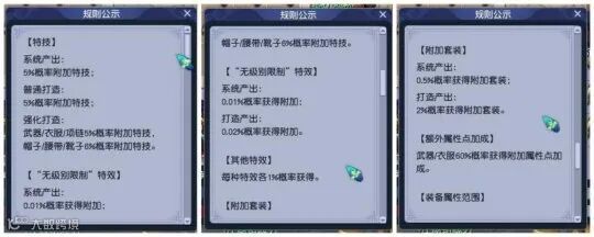 从规则公示上看:系统产出的装备附加特技、特效、套装的概率普遍都要低于玩家打造。系统产出装备时,附加“无级别限制”特效的概率仅有0.01%,而通过玩家打造方式产出时,概率为0.02%,能出无级别的玩家是真正的欧皇啊。
