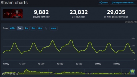 口说无凭,那就再让咱们看看具体数据吧。自《暗黑破坏神4》第四赛季更新后,它在Steam上的在线玩家人数最高达到29035人,这也是《暗黑破坏神4》登陆Steam后取得的在线玩家峰值。