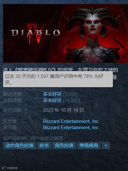 过去的30天里,《暗黑破坏神4》的好评率为78%达到了“多半好评”的层级,较之此前的“褒贬不一”有了很大的提升。