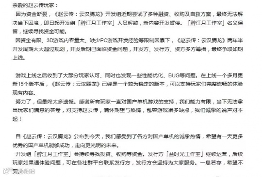 而在近期,《赵云传:云汉腾龙》的开发团队又被曝出了新危机。由于资金链断裂,且寻求收购、融资无果后,开发团队醉江月工作室正式宣告解散,有关新内容的开发也就此暂停。游戏本身虽然还会由发行方继续运营,但更新恐怕指望不上了。